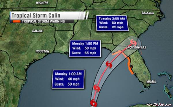 Hôm 6/6, trận bão nhiệt đới Colin đã đổ bộ vào bang Florida của Mỹ mang theo mưa lớn và gió mạnh. Thống đốc bang Florida Rick Scott đã công bố tình trạng khẩn cấp tại 64 khu vực khi trận bão di chuyển qua Vịnh Mexico tiến tới vùng bờ biển phía Tây Bắc bang này.