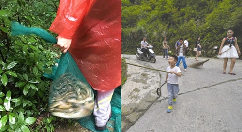 Dân làng bắt được hàng túi rắn to. Ảnh: Shanghaiist