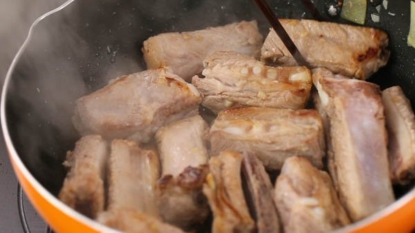 - Bắc chảo lên bếp, cho dầu ăn (không cần quá nhiều, chỉ đủ để rán cháy cạnh sườn), bỏ sườn vào rán đến khi sườn săn lại, màu hơi vàng, xém cạnh. Trút sườn ra giấy thấm dầu cho bớt mỡ.