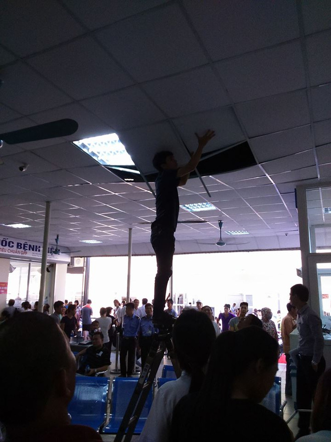 Ông Quang cũng cho biết, trong lúc người bệnh chờ khám một tấm kim loại trên trần nhà bất ngờ rơi xuống khiến một em bé bị thương nhẹ.