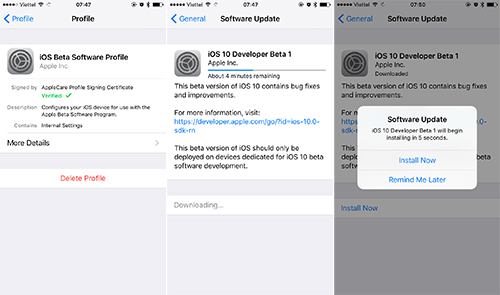 Đầu tiên, bạn tải về file cấu hình tại đây trên iPhone. Thiết bị yêu cầu xác nhận cài đặt cấu hình mới, sau đó cần khởi động lại máy. Tiếp theo, người dùng truy cập Settings > General > Software Update để tải về iOS 10 beta 1. Phiên bản thử nghiệm này có dung lượng khoảng 1,7 GB.