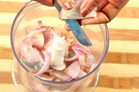Bước 1: Cắt nhỏ hành tím thành những mảnh nhỏ rồi bỏ vào máy xay sinh tố để làm nhỏ hoặc bạn cũng thể đâm nhỏ bằng cối nếu không có máy xay sinh tố vì không yêu cầu phải xay xuyễn lắm.