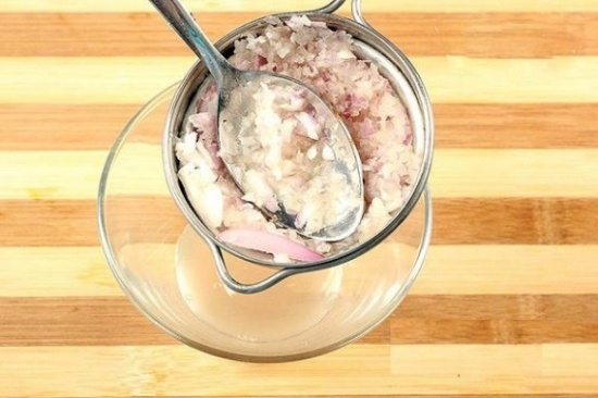 Bước 2: Dùng rây lọc để lọc lấy nước hành tím vào bát.