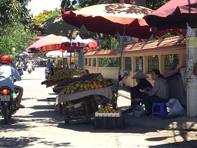 Hàng ngày, chị phải phơi nắng 10 tiếng đồ hồ liên tục dưới mức nhiệt trên 40 độ C, đường bê tông bốc lên hơi nóng hầm hập đến khó thở. Trên trời nắng dội xuống, không một hơi gió mát, người bán phải đứng ké dưới bóng râm của chiếc ô dù che cho hoa quả khỏi héo.