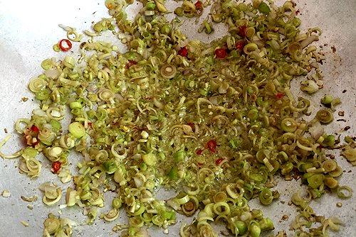 Bật bếp, bắc chảo lên bếp đến khi chảo nóng thì cho dầu ăn vào. Dầu sôi cho hành tím, tỏi bằm, sả và ớt bằm vào xáo cho đến khi trở vàng có mùi thơm. Việc xào cả ớt bằm là bí quyết giúp món ăn có màu vàng đẹp và mùi thơm khi hoàn tất.