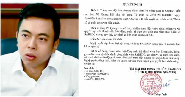 Giấy điều động Vũ Quang Hải làm thành viên Hội đồng Quản trị đại diện cho cổ phần nhà nước, kiêm chức phó tổng giám đốc Công ty Bia rượu nước giải khát Sài Gòn (Sabeco).
