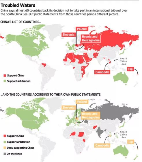 Tuy nhiên, phản ứng của các nước trên có vẻ không được như ý Bắc Kinh: Trong số 60 nước mà Trung Quốc rêu rao chỉ có 8 nước chính thức lên tiếng ủng hộ Trung Quốc tẩy chay các thủ tục tố tụng tại The Hague.