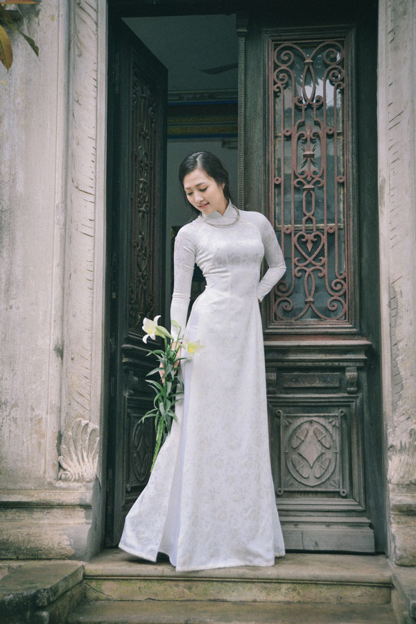 Bộ ảnh áo dài được thực hiện tại làng biệt thự cổ Phú Xuyên đẹp mơ màng trong áo dài gấm trắng.