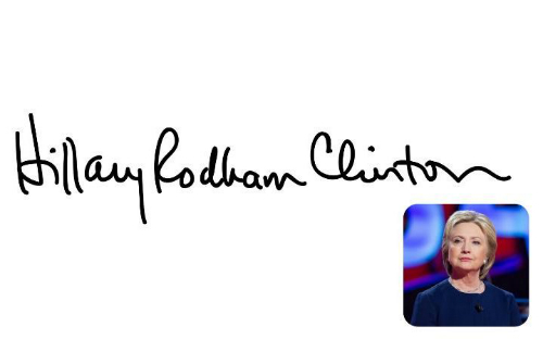 Trong khi đó chữ ký của ứng viên tổng thống Mỹ đảng Dân chủ Hillary Clinton lại được tin là cho thấy sự tập trung. Chữ H trong chữ ký của bà Clinton được viết rất cao, và mọi chữ khác đều có phương thẳng đứng, cho thấy sự độc lập, nhiệt huyết. Sự chú tâm bà Clinton dành cho chữ ký của mình cho thấy bà sẽ làm mọi việc theo ý mình, và rất nỗ lực khi làm việc đó.