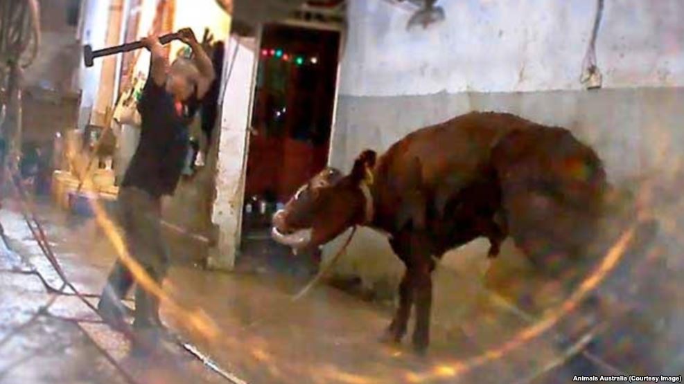 Video do tổ chức bảo vệ động vật “Animals Australia” công bố cho thấy bò được cho là nhập khẩu từ Úc đã bị đập cho tới chết bằng búa tạ.