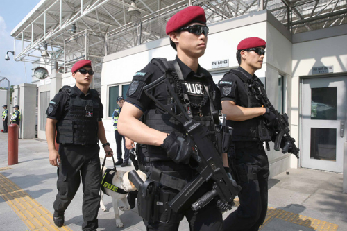 Đội phản ứng nhanh Hàn Quốc gác bên ngoài Đại sứ quán Mỹ tại Seoul. Ảnh: Yonhap