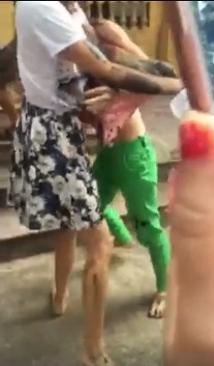Hai người phụ nữ mặc áo đen và áo hồng còn cởi giày dép ra đánh liên tiếp vào người cô gái trẻ, còn người khác thì kéo áo lên đổ mực vào người cô gái. Bị đánh đập, chửi bới nhưng cô gái không hề xin xỏ hay giải thích gì mà chỉ khóc và nấp sau người khác tránh bị đòn.