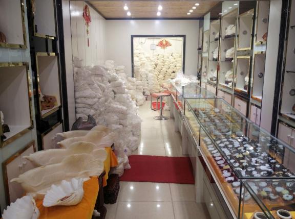 Một cửa hàng bán các đồ trang trí từ vỏ trai khổng lồ ở Tanmen (đảo Hải Nam, Trung Quốc). Ảnh Reuters