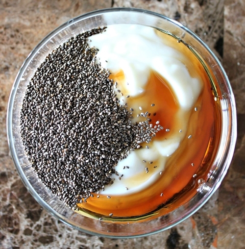 Chuẩn bị 1 ly sữa chua không đường (hoặc ít đường), 1 thìa hạt chia, mật ong. Rắc 1 thìa hạt chia lên sữa chua, cho thêm một thìa cà phê mật ong. Khuấy đều và thưởng thức.