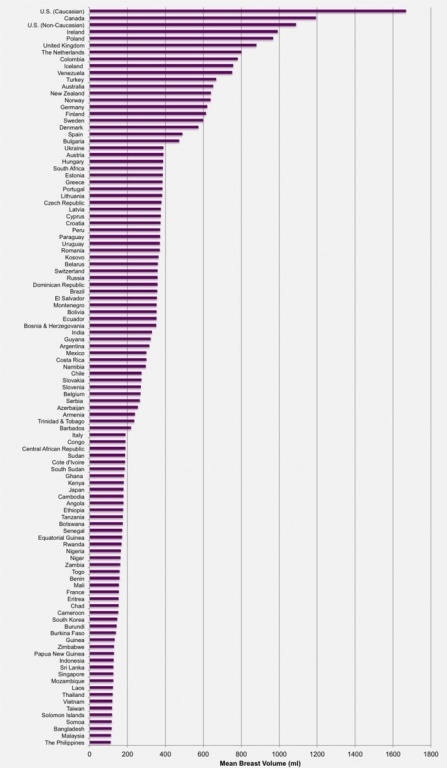 Về mặt thể tích, ngực của phụ nữ Mỹ da trắng cũng đứng đầu bảng xếp hạng, trung bình là 1.668 ml. Trong khi đó, phụ nữ châu Á thường nhỏ hơn 200 ml. Cụ thể, phụ nữ Việt Nam có cup ngực trung bình nhỏ hơn cỡ A, và thể tích trung bình là 121 ml, chỉ hơn phụ nữ Đài Loan, Bangladesh, Malaysia... Đứng cuối bảng kết quả là phụ nữ Philippines.