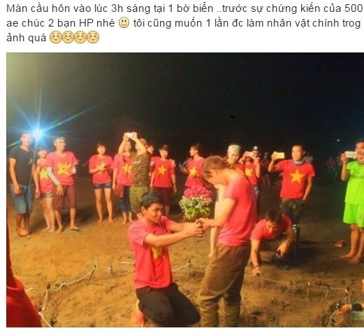 Dưới sự chứng kiến của khoảng 50 anh em trong một nhóm phượt, chàng trai đã bất ngờ quỳ gối, tặng hoa bạn cô gái vào lúc 3h sáng tại bãi biển Cồn Vành, Thái Bình.