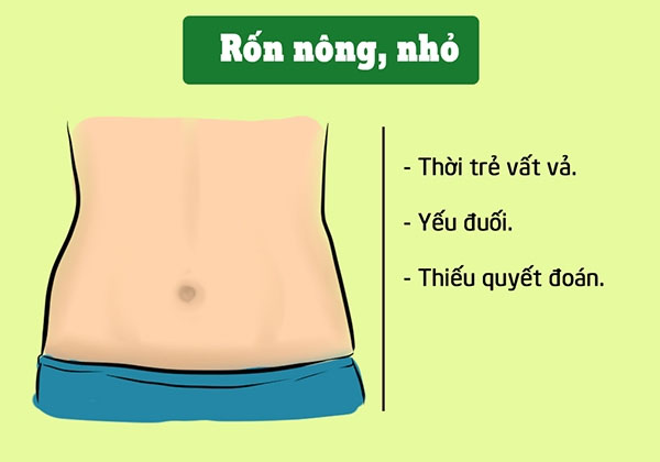 Theo nhân tướng học, rốn nông, nhỏ là biểu hiện của những người phải chịu nhiều vất vả khi còn trẻ. Họ đa phần là những người yếu đuối, thiếu quyết đoán nên rất cần có chỗ dựa. Đối với họ, chỉ cần có một điểm tựa vững chắc thì lại đột ngột trở thành một con người khác, tự tin hơn, mạnh mẽ, kiên cường hơn.