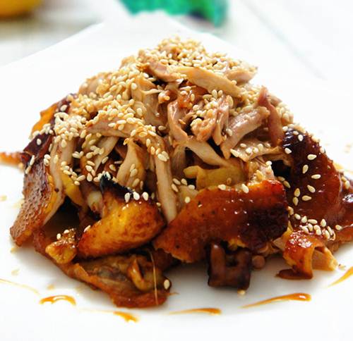 – Bạn có thể ăn cả miếng hay xé gà ra nhiều miếng nhỏ rồi rắc vừng rang lên bày ra đĩa.