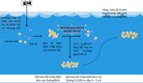 Màu nước bất thường không phải là màu của tảo nở hoa hay phù sa mà là dạng keo sắt hấp thụ các độc tố như phenol, xyanua - sản phẩm do hoạt động xả thải của con người gây ra. Phân tích màng dịch nhày bao bọc thân cá trên rạn san hô thu được ở Thừa Thiên - Huế ngày 24/4 cũng thu được hàm lượng sắt cao và có chứa phenol.
