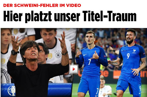 Trong khi đó, báo giới Đức tỏ ra khá chua xót khi viết về thất bại của đội nhà. Tờ Bild lo lắng về tương lai không rõ ràng của HLV Joachim Low, và tổng hợp một video ghi lại tình huống Bastian Schweinsteiger để bóng chạm tay trong vòng cấm Đức dẫn đến bàn mở tỷ số của Griezmann. Bild chua chát giật tít cho đoạn video này: “Khoảnh khắc giấc mơ tan vỡ”, kèm theo dòng chữ nhỏ phía dưới: “Ngay cả Neuer cũng mắc sai lầm”.