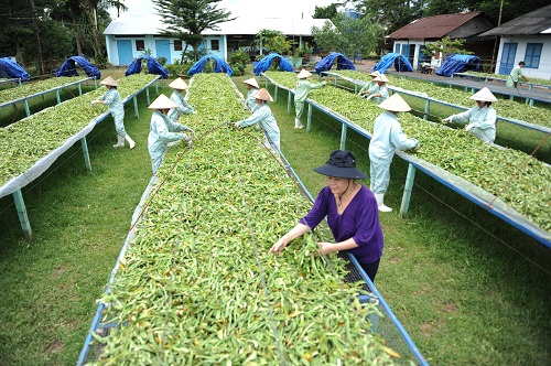 Tiến sĩ, dược sĩ Nguyễn Thị Ngọc Trâm (áo tím) kiểm tra khâu phơi nguyên liệu.