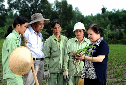 Tiến sĩ, dược sĩ Nguyễn Thị Ngọc Trâm (áo đen) hướng dẫn cách nhân giống trồng trinh nữ hoàng cung.