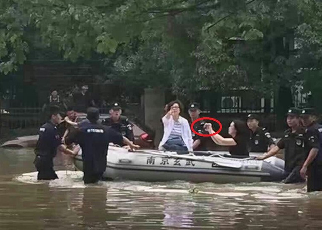 Hôm 6/7 vừa qua trên mạng Xã hội Trung Quốc xuất hiện bức ảnh chụp một phụ nữ mặc áo trắng ngồi trên xuồng cao su có mấy chữ “Nam Kinh Huyền Vũ”, được mấy cảnh sát đặc nhiệm lội dưới nước đẩy đi. Cảnh tượng giống như kiểu quan lớn đi tuần thời xưa.