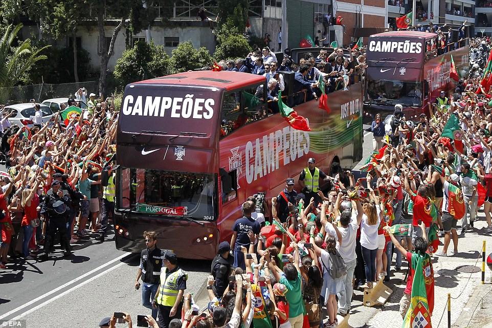 Một đêm sau khi giành chức vô địch EURO lần đầu tiên trong lịch sử, Ronaldo và các đồng đội hành quân về nước với chiến tích là chiếc cúp bạc danh giá.