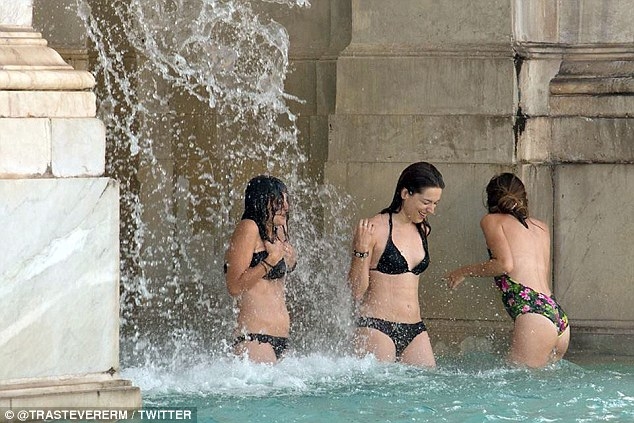 Ba nữ du khách bị bắt gặp mặc bikini đùa nghịch ở đài phun nước 400 năm tuổi (ảnh: Twitter)