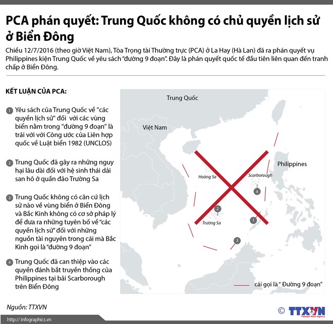 Cách đây ít tiếng, PCA đã chính thức đưa ra phán quyết về vụ kiện Biển Đông. Vụ kiện này đã chính thức kết thúc sau 3 năm thụ lý. Tòa PCA đã đưa ra 4 phán quyết về "đường chín đoạn" của Trung Quốc và phần thắng đã thuộc về Philippines.