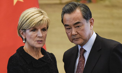 Ngoại trưởng Australia Julie Bishop và người đồng cấp Trung Quốc Vương Nghị trong một cuộc gặp hồi đầu năm nay. Ảnh: AFP