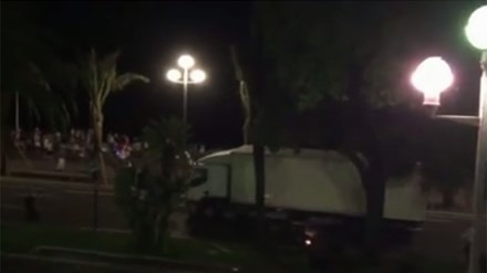 Cảnh này được quay từ một ban công cho thấy chiếc xe tải trắng lao đi trên đường Promenade du Paillon, thành phố Nice, Pháp. Một người lái môtô đã đuổi theo, tung mình để bám vào xe tải, cố gắng chặn nó lại trước khi xe lao vào đám đông đang xem pháo hoa. Một số cảnh sát dường như đã nổ súng để cố chặn chiếc xe nhưng không thành công.