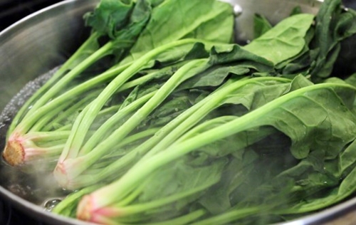Bước 2: Đun sôi nồi nước, cho rau cải bó xôi vào luộc chín tới. Rửa lại bằng nước lạnh, để ráo.