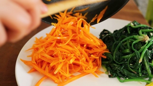 Đun nóng một ít dầu ăn trong chảo, bóp bỏ nước ở cà rốt rồi cho cà rốt vào xào trong chảo khoảng 1 phút rồi cho ra đĩa.