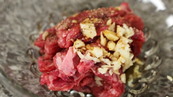 Bước 4: Thịt bò cắt thành các dải dài 7.5cm – 9.5cm, dày khoảng 1.5cm. Cho thịt bò vào bát, thêm 2 muỗng canh nước tương, 1 tép tỏi băm nhỏ, ¼ muỗng cà phê hạt tiêu đen, đường, 2 muỗng cà phê dầu mè.