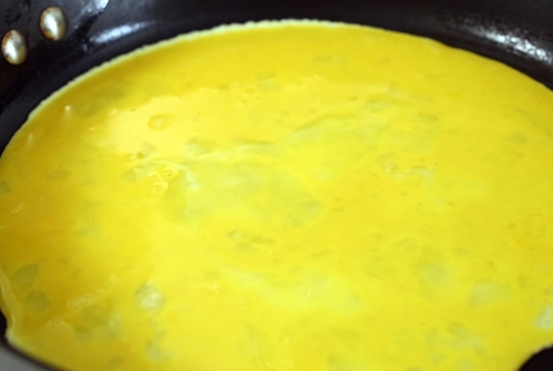 Phun ít dầu lên chảo nóng trên bếp, dùng khăn giấy lau sạc, chỉ có chút dầu mỏng bám vào chảo. Hạ nhỏ lửa, cho trứng vào, tráng chín cả hai bên, cho ra đĩa. Cắt thành các dài dài, có độ rộng 1.25cm.