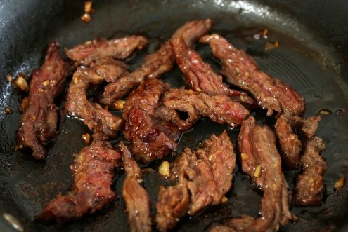 Bước 6: Cho thịt bò vào chảo, đảo chín, cho ra đĩa.