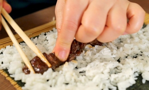 Bước 7: Cho miếng rong biển lên trên mành tre, rải cơm đều khắp miếng rong biển, rồi lần lượt xếp thịt bò, cà rốt, dưa củ cải, dảo trứng, rau cải bó xôi, rồi cuộn lại. Dùng vài hạt cơm để dính mép rong biển lại.