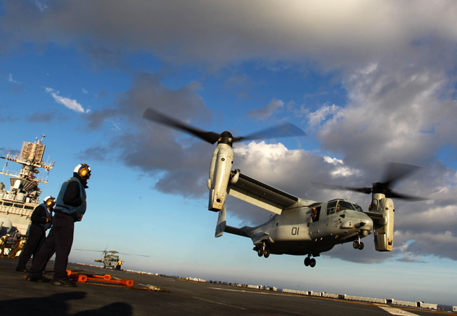 Trực thăng cánh xoay V-22 "ưng biển" cất cánh từ tàu sân bay Mỹ
