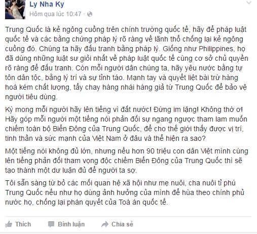 Tuy nhiên mới đây, theo thông tin trích dẫn lại từ báo điện tử Công an Nhân dân, trên trang cá nhân, Lý Nhã Kỳ khiến cộng đồng mạng bất ngờ khi cô mạnh mẽ tuyên bố sẵn sàng từ bỏ những “tình thân” và các mối quan hệ xã hội thân thiết với một số tỉ phú Trung Quốc nếu như họ dùng ảnh hưởng của mình để hùa theo chính phủ nước họ, chống lại phán quyết của Toà Trọng tài quốc tế.
