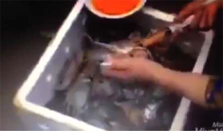 Clip ghi lại cảnh một người phụ nữ dùng một chiếc xi lanh to, bơm một chất lỏng màu nâu vàng vào trong những con cua đã chết. Được biết clip này có nguồn gốc từ Trung Quốc và hành vi của người phụ nữ này là "chiêu trò" khá quen thuộc của những người buôn bán hải sản.