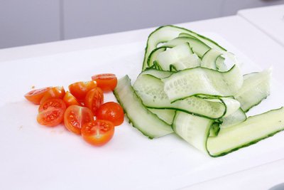 Dưa chuột và cà chua rửa sạch. Cắt cà chua bi làm đôi và nạo dưa chuột thành từng miếng dài mỏng.
