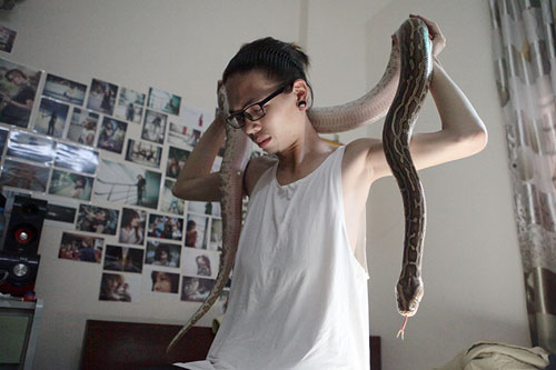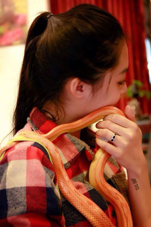 Hình ảnh ấn tượng nhất với nhiều người có lẽ là lúc chú trăn bóng cuốn trên cổ, hay một chú rắn trườn dọc cánh tay đi dạo trên phố. “Đối với mìnhmỗi loài động vật đều có sức cuốn hút riêng nhưng với trăn và rắn, mỗi lần nhìn vào đôi mắt dễ thương ấy khiến mình có cảm giác như tình yêu sét đánh vậy” , Trang thổ lộ.