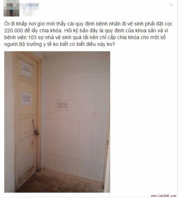 Theo phản ánh trên một diễn đàn, tại khoa Sản có 2 nhà vệ sinh đều bị khóa lại. Người nhà hay bệnh nhân muốn đi vệ sinh phải đặt cọc 220.000 đồng để lấy chìa khóa.