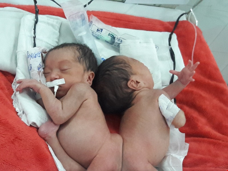 Lại hai bé sinh đôi dính liền. Hai bé nặng 3.4 kg. Sức khỏe của các cháu yếu. Ôi! thương quá.