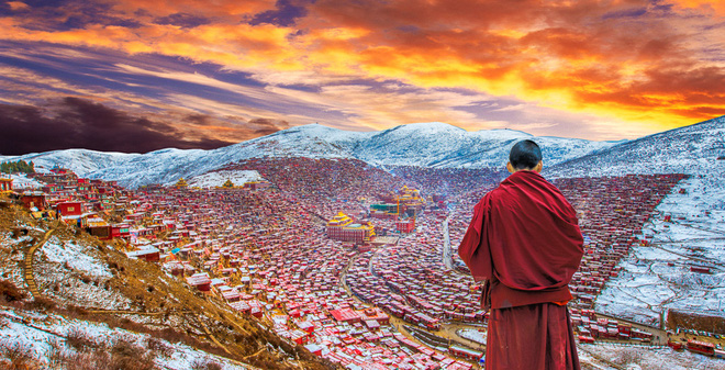 Học viện Larung Gar, còn có tên là Học viện Phật giáo Ngũ Minh, nằm ở độ cao hơn 4.000m so với mặt nước biển và thu hút với quần thể kiến trúc xếp bậc thang với hàng chục nghìn ngôi nhà bằng gỗ đỏ nổi tiếng thế giới.