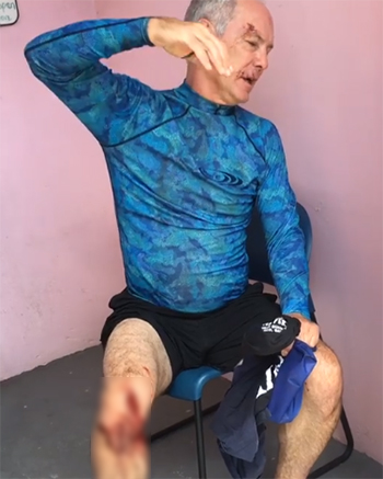 "Những người đi cùng giúp tôi lên thuyền. Có rất nhiều máu. Chúng tôi kiểm tra tình hình, chắc chắn rằng mọi bộ phận trên cơ thể vẫn nguyên vẹn, tôi được chườm nước đá và đưa đến phòng khám y tế trên hòn đảo nhỏ", ông kể.