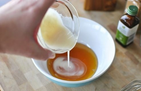 - Đổ nước cốt dừa ra chén, sau đó cho lần lượt mật ong, dầu oliu vào và trộn thật đều.