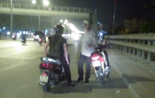 Tuấn Anh kể: "Lúc đó, tôi đi trên đường, đang quay lại đẩy xe giúp thì thấy một chị tầm 30-40 tuổi đưa chai xăng vừa mua cho bác bị hỏng xe.