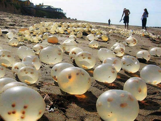 Do không gắn với vật cố định nào nên chúng thường trôi nổi trên biển, khi các cơn băo xảy ra, chúng dạt vào bờ và mắc kẹt lại, gây chết hàng loạt. T́nh trạng của những quả trứng trong bức ảnh rất có thể đang rơi vào trường hợp không may đó. Tuy nhiên, theo nhiều nghiên cứu, hiện tượng này rất hiếm gặp, lần đầu tiên xảy ra là cách đây 3 năm.